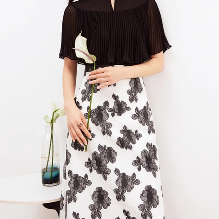 珂莱帝同款夏季新款法式气质设计感透气拼接假两件披肩袖连衣裙女