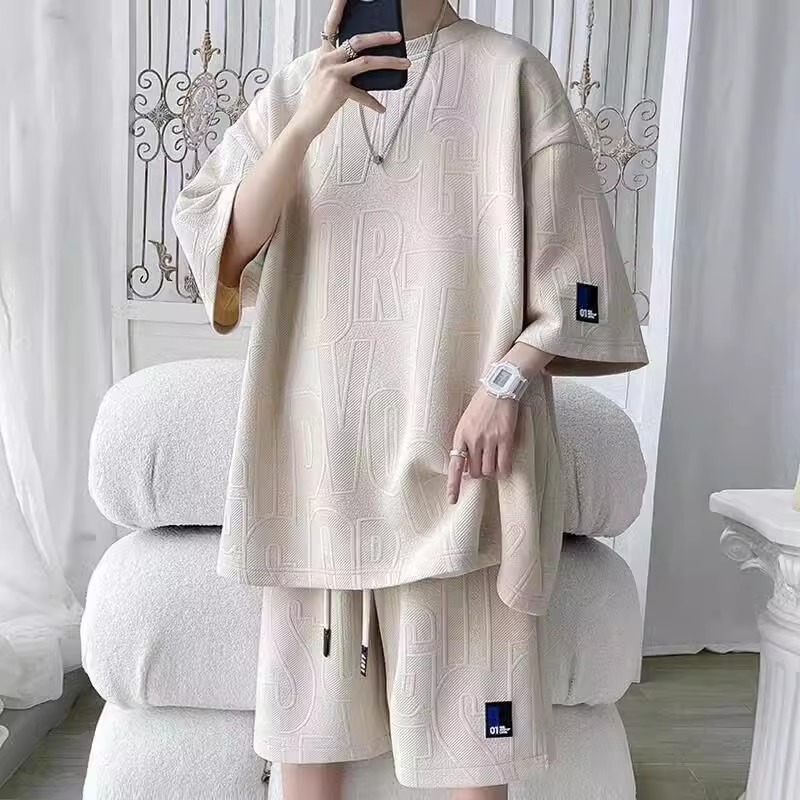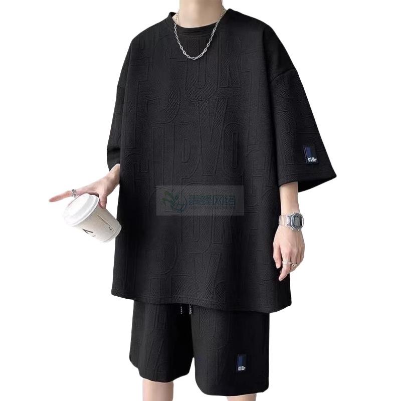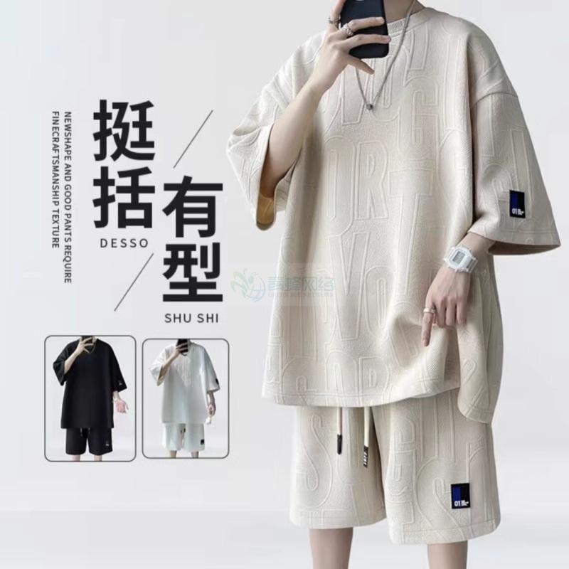 华夫格套装男夏季潮牌帅气一套搭配宽松休闲运动短袖短裤两件套男